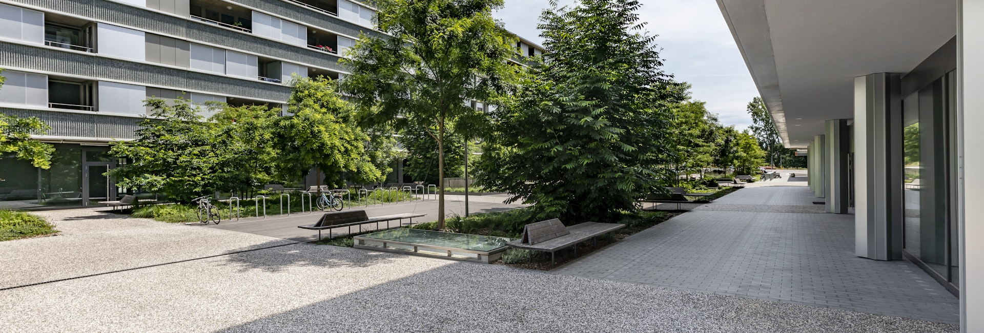 Ce bâtiment Minergie avec panneaux solaires, dont la construction s'est achevée en 2019, se distingue par ses façades modernes et urbaines.